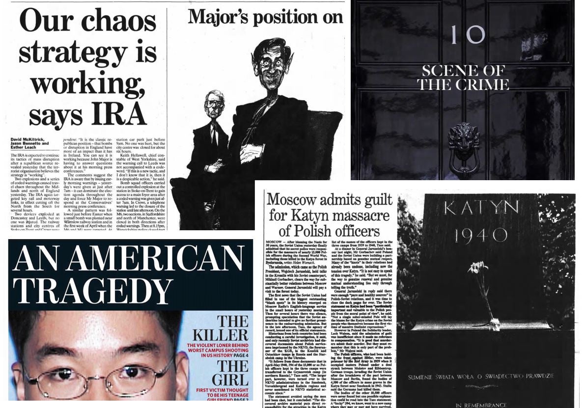 Destruction and deception dominate this week’s news. The world grieves the loss of 32 lives in the Virginia Tech massacre and watches in horror as flames engulf the iconic Notre-Dame Cathedral. Meanwhile, political leaders are forced to face reckonings of their own. From the Soviet Union finally admitting to the Katyn massacre of nearly 15,000 Poles after half a century of denial, to Boris Johnson becoming the first sitting prime minister fined for breaking the law, history unfolds across the front pages of The Independent.
